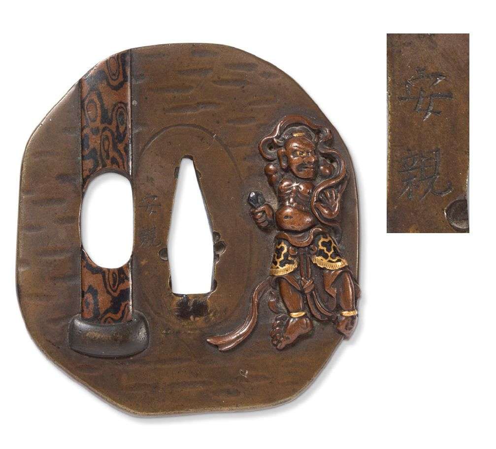 Tsuba hashi gaku (octogonale) en sentoku à décor en takazogan partiellement doré, représentant un Nyô auprès de la colonne d'un temple, le revers orné d'une corbeille.