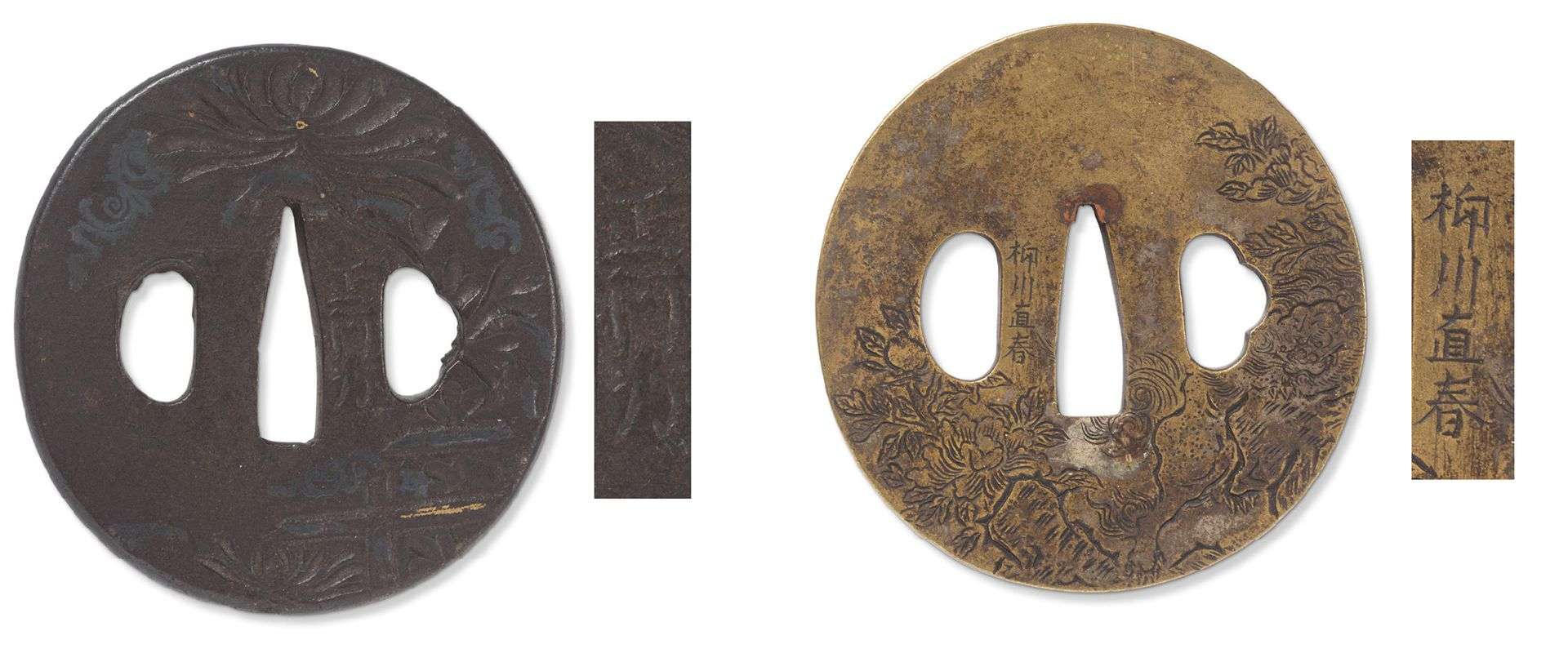 Deux tsuba marugata, l'une en fer ornée en creux de chrysanthèmes et balustrade, signée