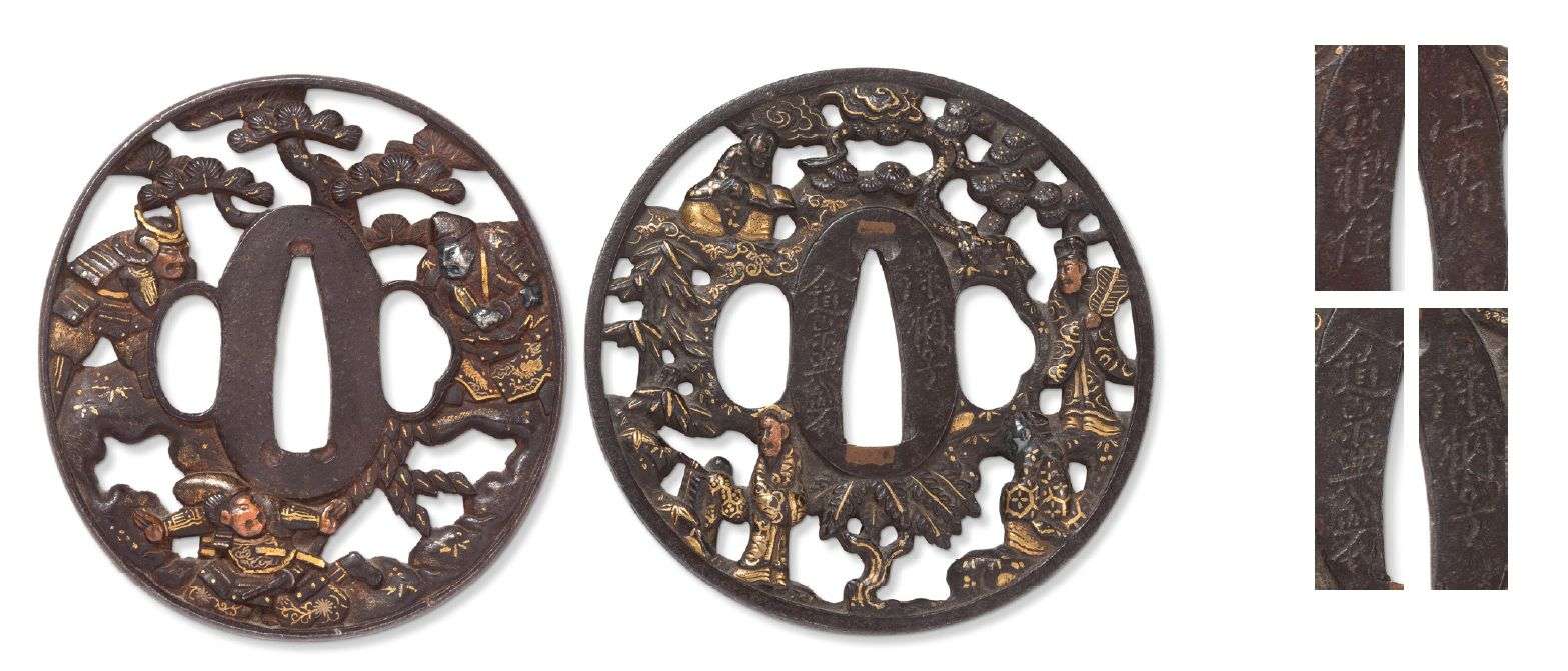 Deux tsuba maru-gata en fer ajourées en maru-bori, à décor rehaussé en nunomezogan or, de sages se distrayant auprès de pavillons, signée Mogarashi