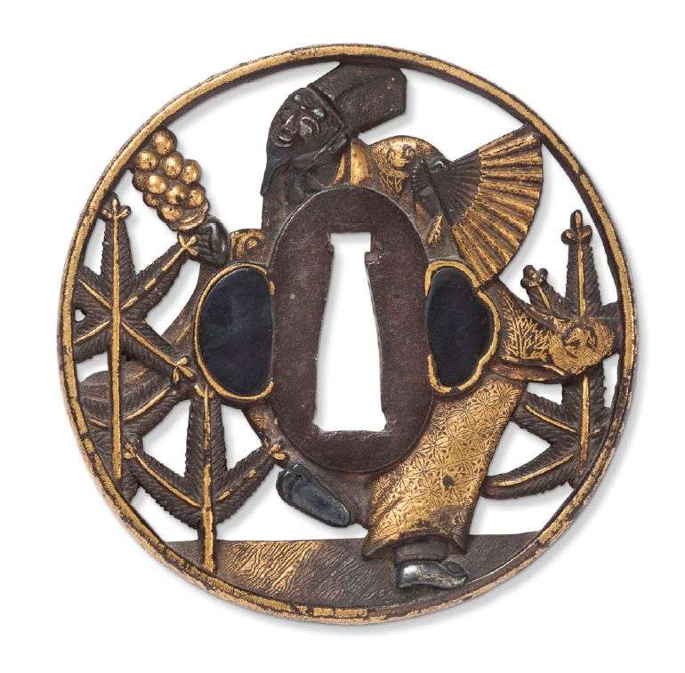 Sukashi tsuba maru-gata en fer ornée en nunomezogan d'un danseur de sambaso tenant éventail et grelot, auprès de jeunes pins, le mimi doré, les deux hitsu obturés de shakudo. Non signée.