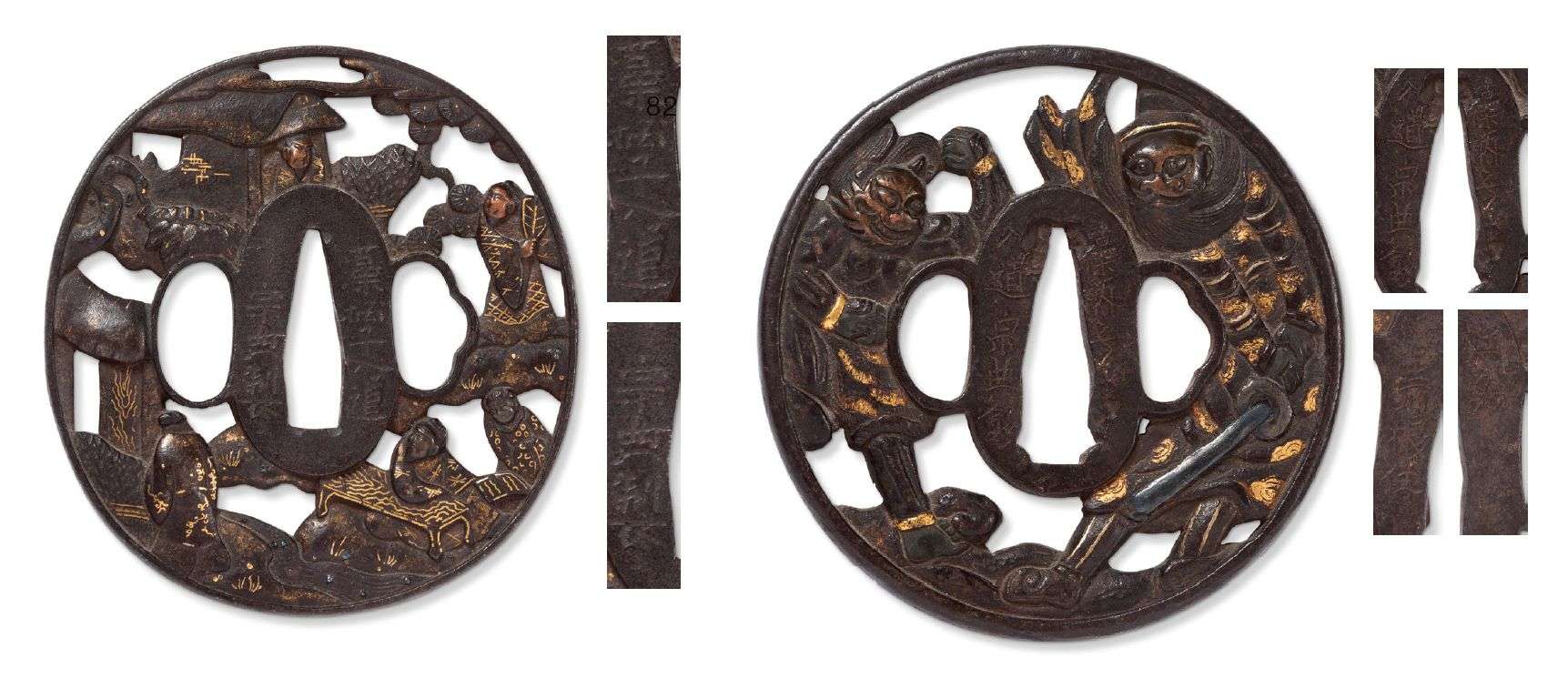 Deux tsuba maru-gata en fer et rehauts dorés, ajourée en maru-bori, l'une représentant de trois sages parmi des pins, l'autre, le roi des singes combattant un oni.