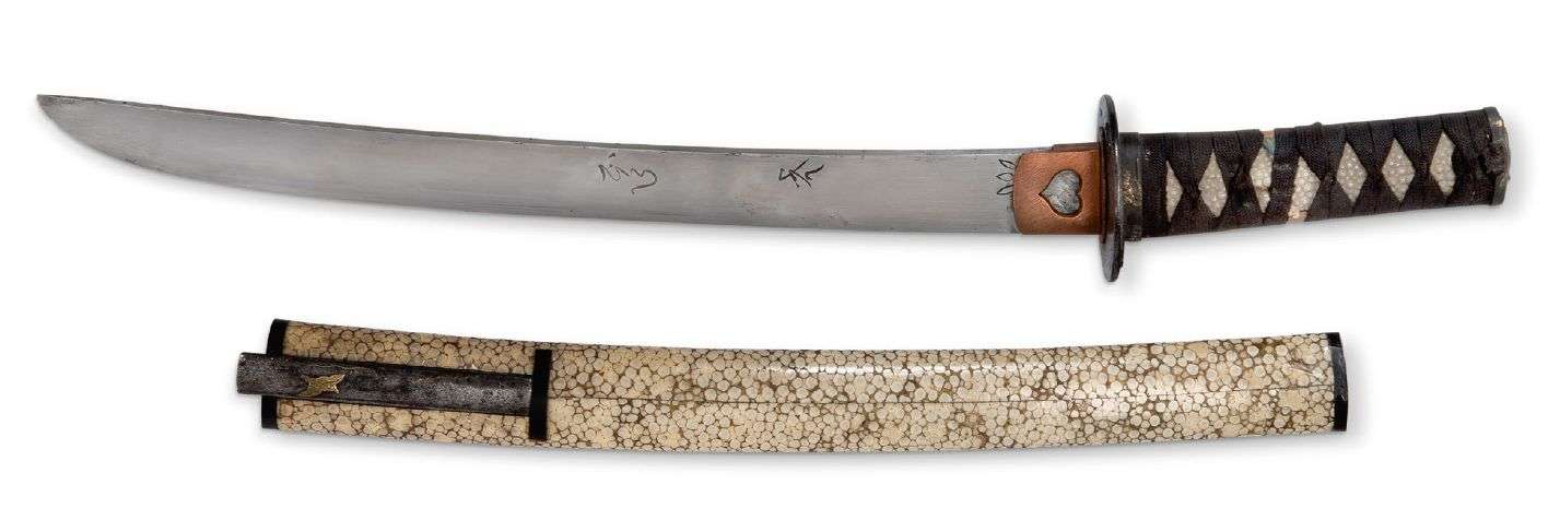 Tanto à lame de 33,8 cm de nagasa, à double-gorge d'un côté et bonji de l'autre, signée Wakasa No Kami Uji Fusa non datée, présentant deux mekugi ana, la trempe sugu-ha avec présence d'hakobore sur la pointe. Habaki ajouré d'un oeil de sanglier.