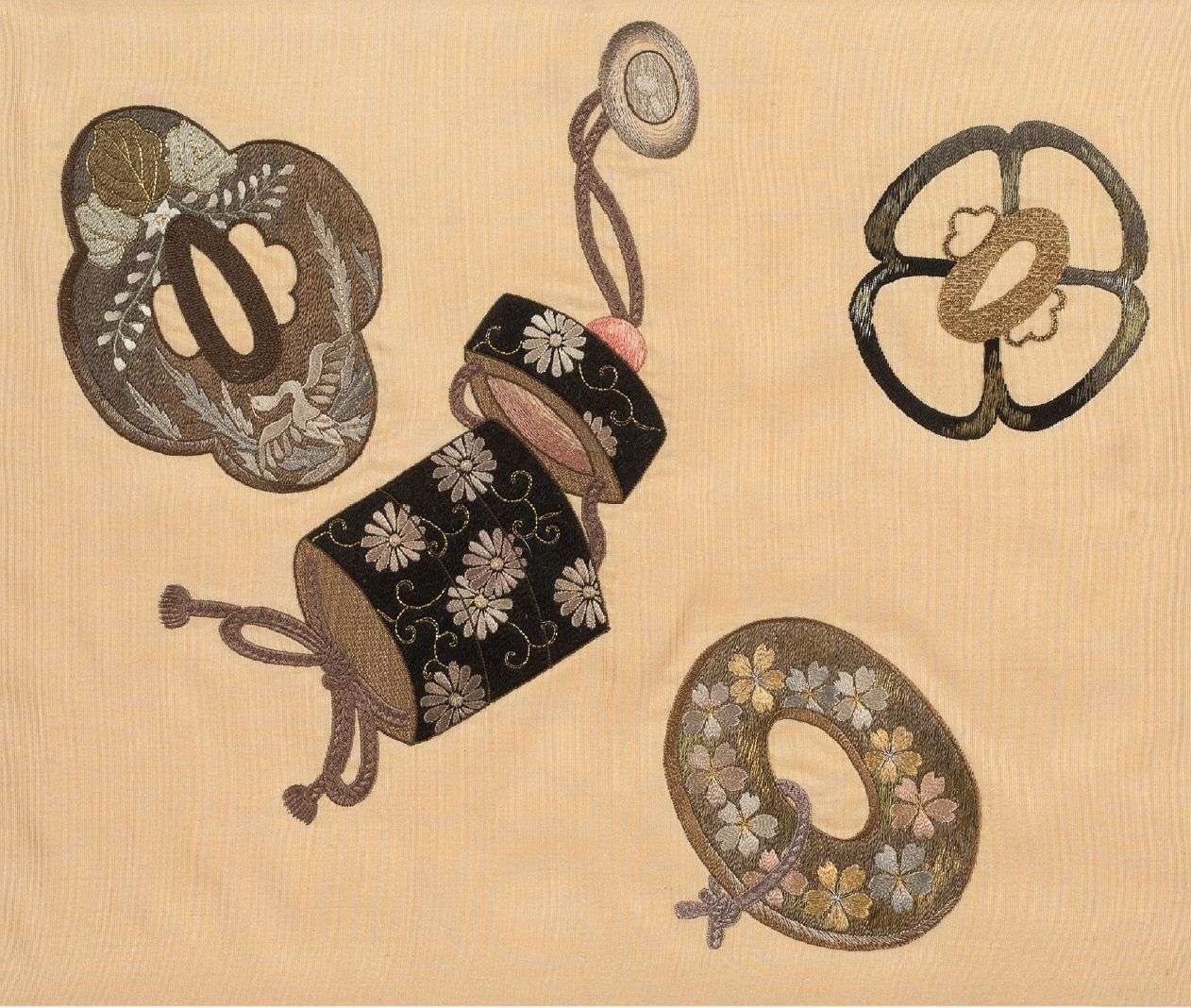 Panneau de soie brodée en polychromie de tsuba et d'un inrô. Dans un cadre en bois doré à décor de spirales en léger relief.