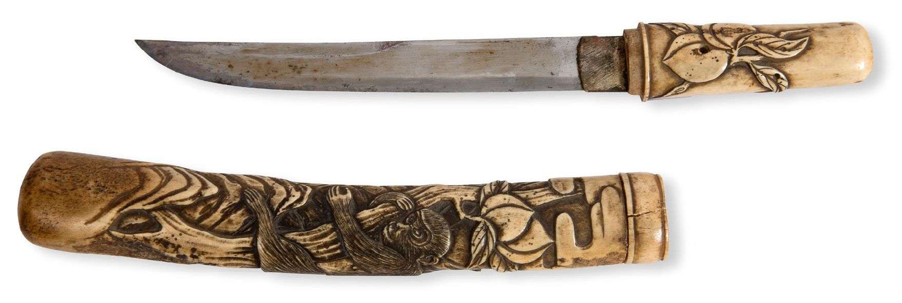 Petit poignard avec monture en bois de cerf, à décor finement sculpté en relief d'un rapace et d'un singe dans un pin maritime parmi des montagnes