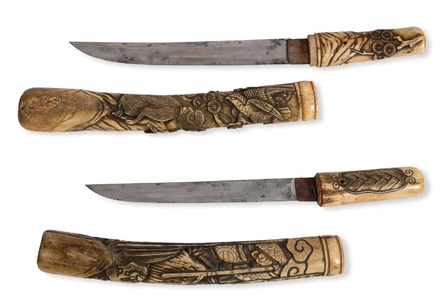 Deux petits poignards avec monture en bois de cerf, l'un à décor sculpté en relief d'un singe grimpant le long d'un pêcher| l'autre représentant des samouraïs et un shishi.