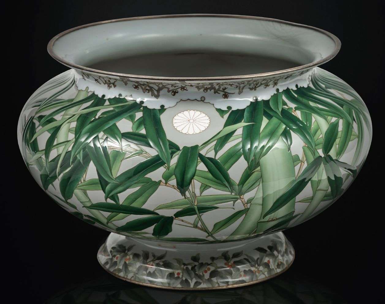 Importante vasque en émaux cloisonnés sur cuivre, finement décoré sur le pourtour central de tiges et feuilles de bambou de couleur verte sur un fond gris clair, la base ornée d'une guirlande de bambous sacrés, le col décoré de branches de cerisiers en fleurs. La base et l'ouverture du col sont sertis d'argent. Deux chrysanthèmes impériaux émaillés blanc à bordures à l'or de part et d'autre. Cachet d'Hattori Tadasaburo sur la base.