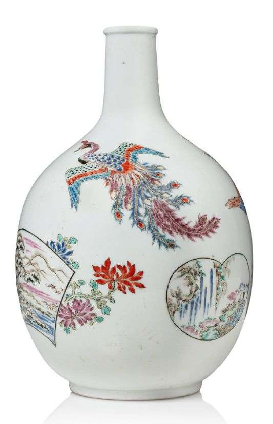 Vase bouteille en porcelaine, à décor polychrome de phénix et grue au-dessus de paysages dans des réserves en forme d'éventails parmi chrysanthèmes et prunus.