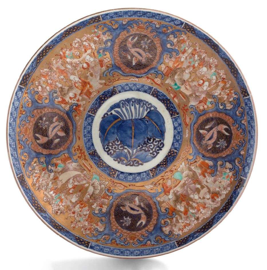 Grand plat en porcelaine à décor bleu, corail et vert sur fond or, de quatre groupes de sages et lettrés, alternant avec des médaillons ornés d'une carpe parmi les flots, autour d'un motif floral central.