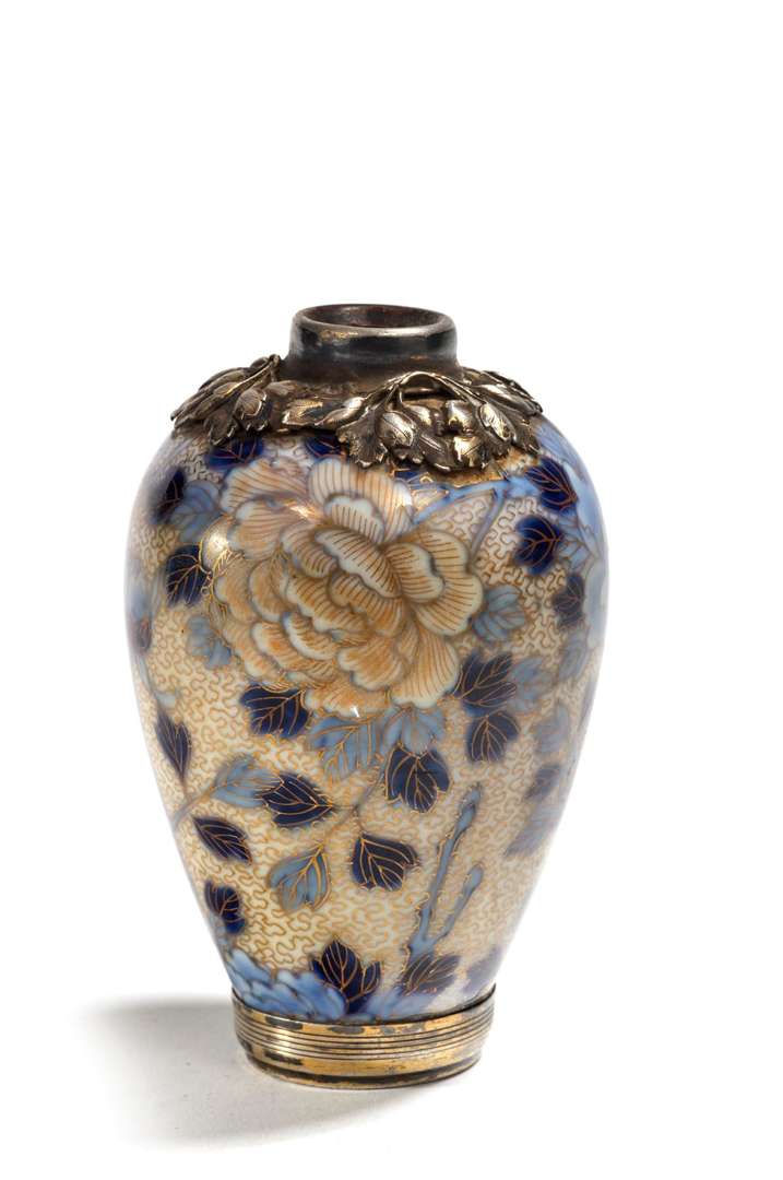 Petit vase en porcelaine à décor de pivoines en camaieu de bleus et rehauts or, l'ouverture et la base cerclées de métal argenté à décor de pivoines.