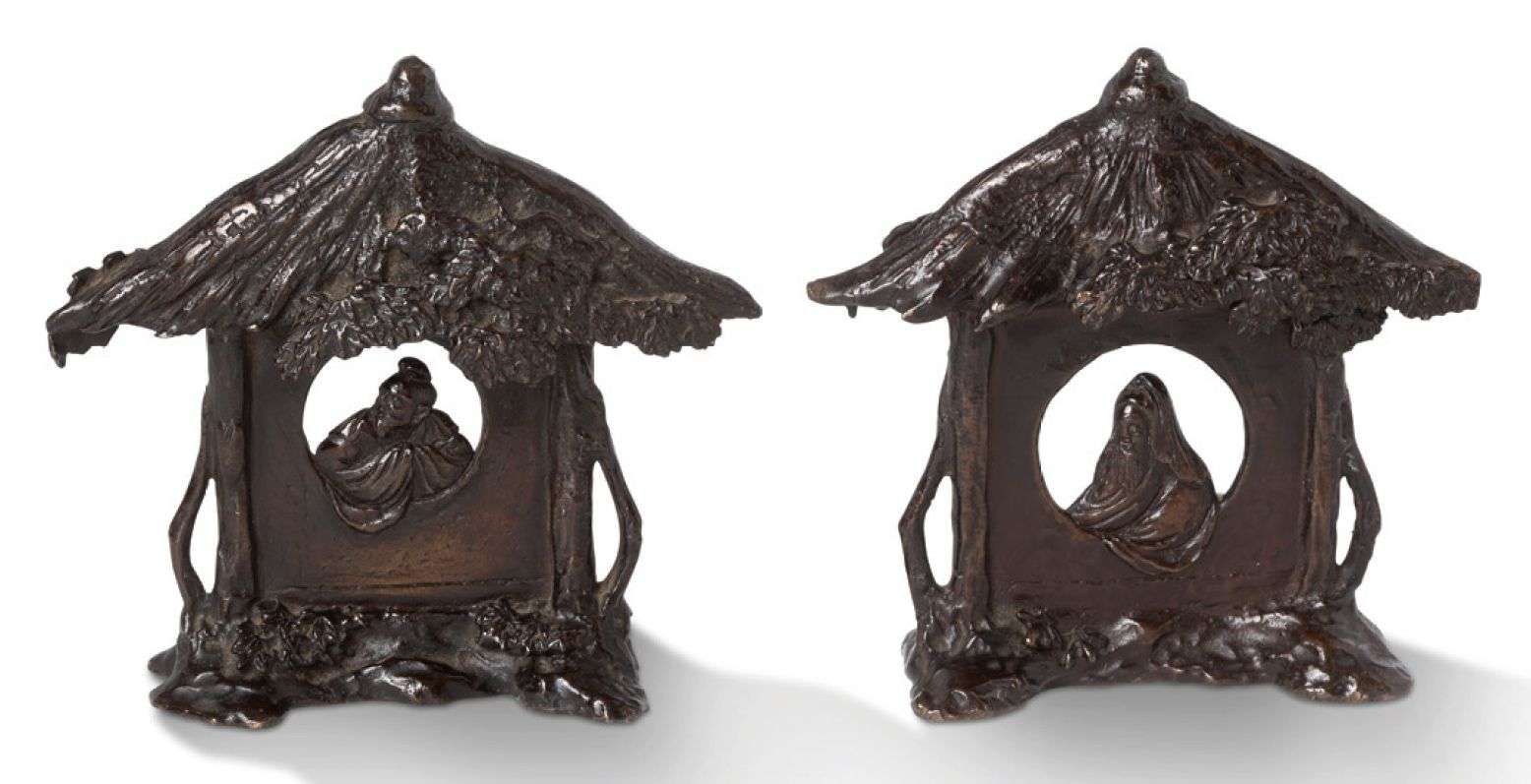 Deux petits sujets en bronze de patine médaille, chacun représentant un sage à la fenêtre d'un pavillon, sous des pins de longévité.