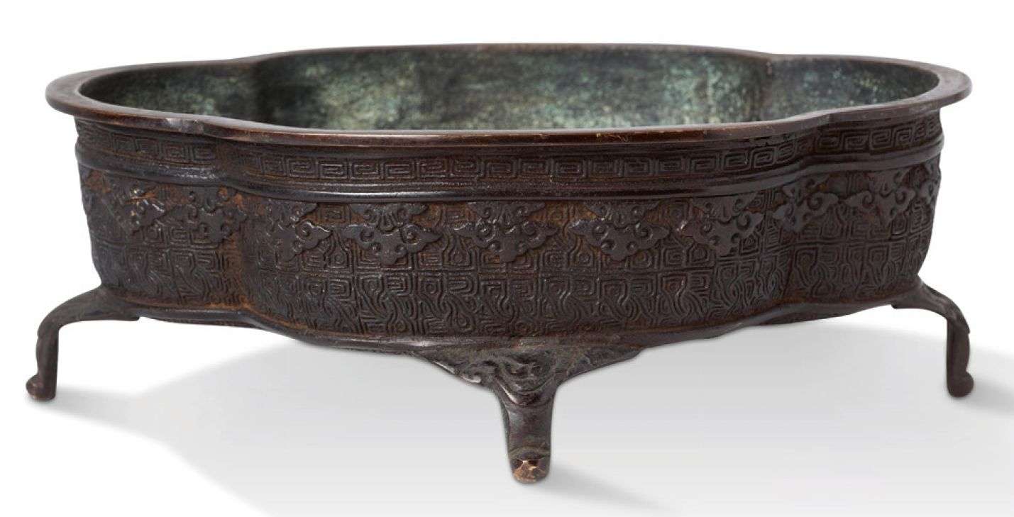 Jardinière floriforme en bronze, à décor d'une guirlande de têtes de ruyi, reposant sur un fond géométrique, la bordure à motifs de grecques. Marque d'atelier sur la base.