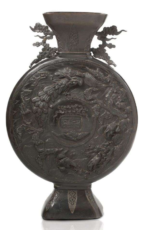 Important vase gourde en bronze à décor de phénix et divinités tournoyantes. Les anses en forme de nuages stylisés.