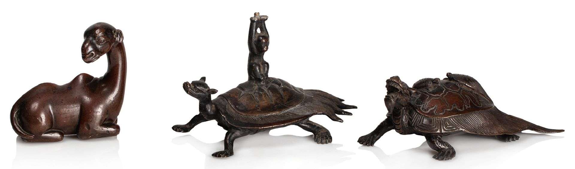 Trois okimono en bronze de patine brune, représentant respectivement une tortue minogame avec deux petites tortues sur le dos| une tortue minogame sur laquelle est assis un singe les bras levés| et un chameau couché, la tête tournée vers l'arrière.