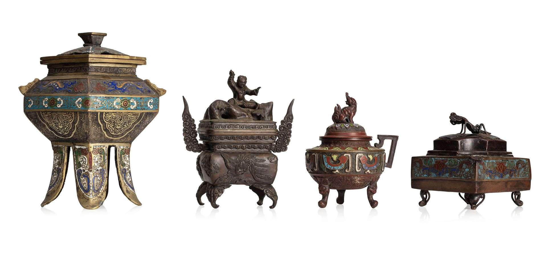 Lot de quatre brûle-parfums couverts, l'un, rectangulaire, en bronze de patine brune, à décor en relief de dragon et phénix, la prise du couvercle figurant un enfant| les trois autres en bronze et émaux champlevés : l'un, losangique à décor archaïsant| le second en fourrure d'éventail, avec cachet sur la base| le troisième, archaïsant, avec la prise en forme de baku.