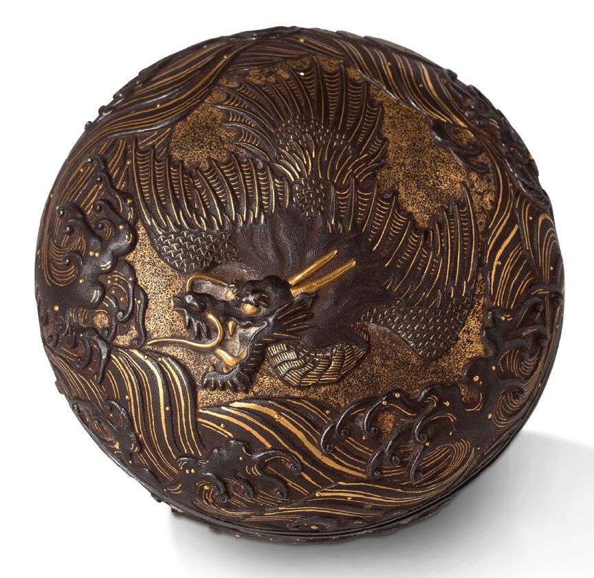 Boite lenticulaire en métal de patine noire et rehauts or, à décor en léger relief d'un poisson-dragon au centre du couvercle, volant au-dessus de flots tumultueux ornant le pourtour de la boite.