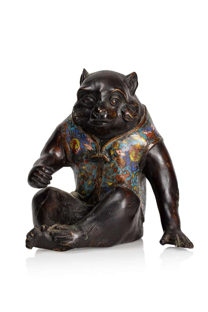Okimono en bronze de patine brune représentant le blaireau Tanuki assis, vêtu d'une petite veste en émaux champlevés polychromes.
