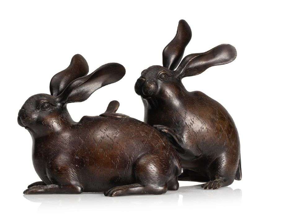 Groupe en bronze de patine brune, représentant deux lapins, l'un couché formant brûle-parfum avec petit couvercle sur le dos, le second assis, les pattes posées sur le dos du premier. Signé