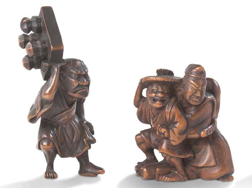 Deux netsuke en buis, représentant deux personnages combattants pour l'un| et un personnage grimaçant, porteur du plateau de Go pour l'autre, avec signature cursive.