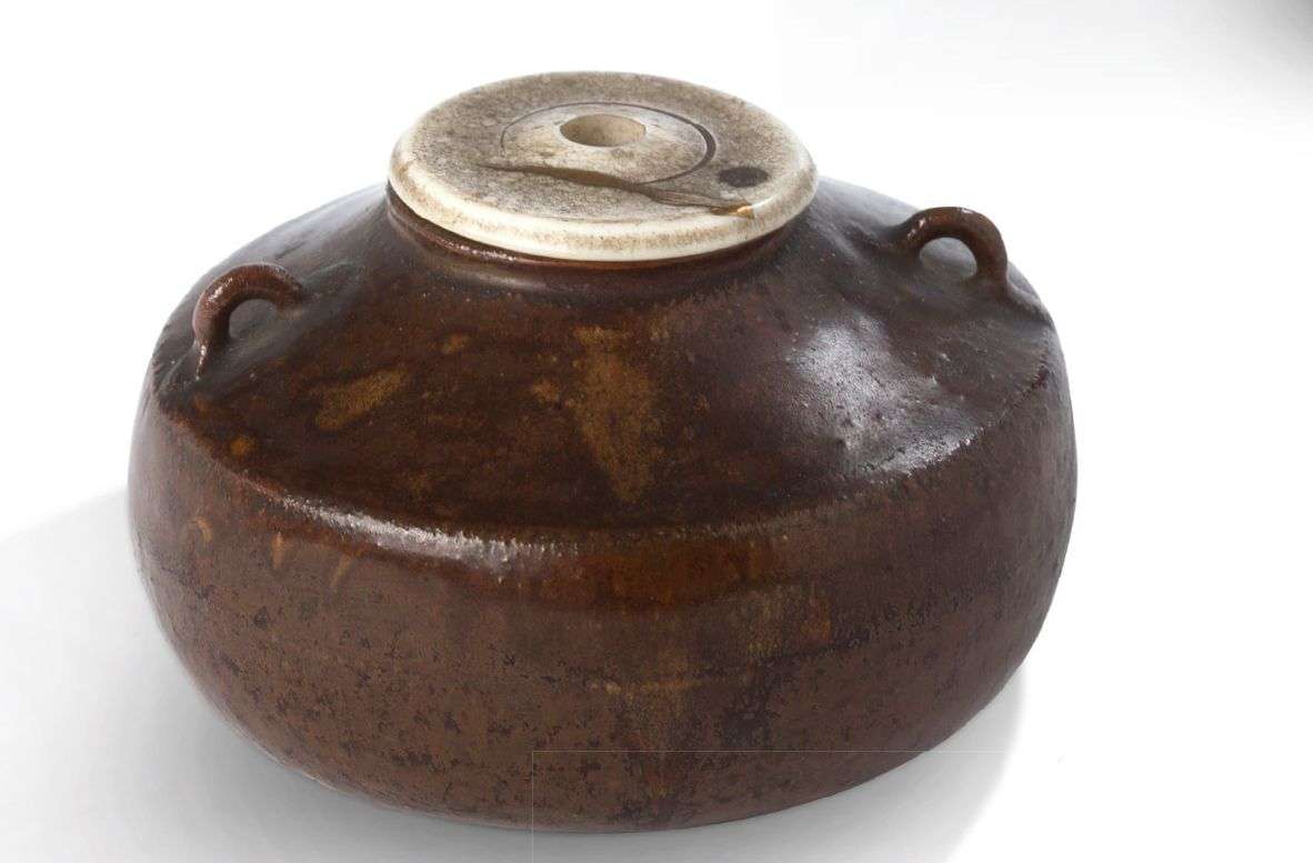 Cha-ire en céramique émaillée brun, légèrement infusé de beige et de noir, orné de deux petites anses et couvercle en bois.