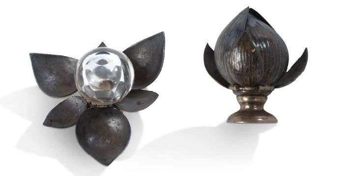 Petit godet de peintre en cristal de roche, reposant sur un support en forme de lotus à pétales amovibles.
