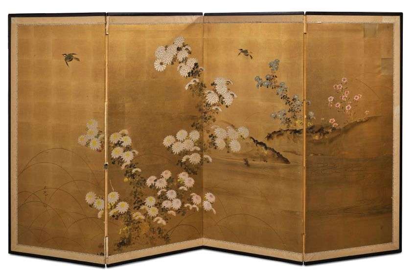 Grand paravent à quatre feuilles, peint à l'encre et couleurs sur soie à fond doré, représentant des oiseaux en vol parmi des chrysanthèmes s'élevant des berges d'un cours d'eau. Signé en bas à gauche (Ikkô ?).