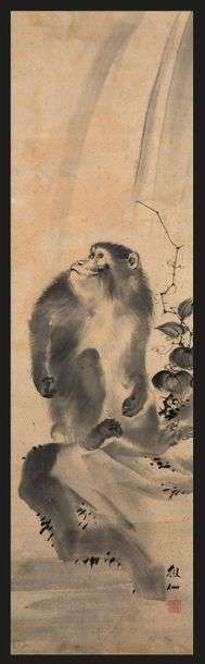 Kakemono au lavis d'encre sur papier représentant un singe assis sur un rocher auprès d'une branche de kaki.