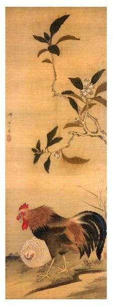 Kakemono en couleurs sur soie représentant un coq et une poule sous une branche de cerisier en fleurs. Signé Issai.