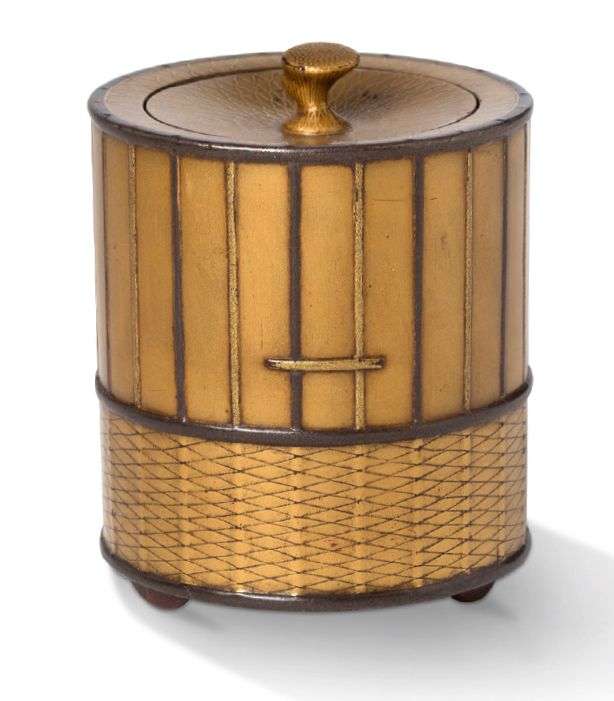 TAKIGARA-IRE Petite boîte de forme cylindrique, en laque kinji et fundame, faite pour recevoir les cendres d'encens encore chaudes, figurant une petite cage en métal et vannerie, les barreaux en léger relief de laque brune, le bouton de préhension du couvercle en forme de tige de bambou.