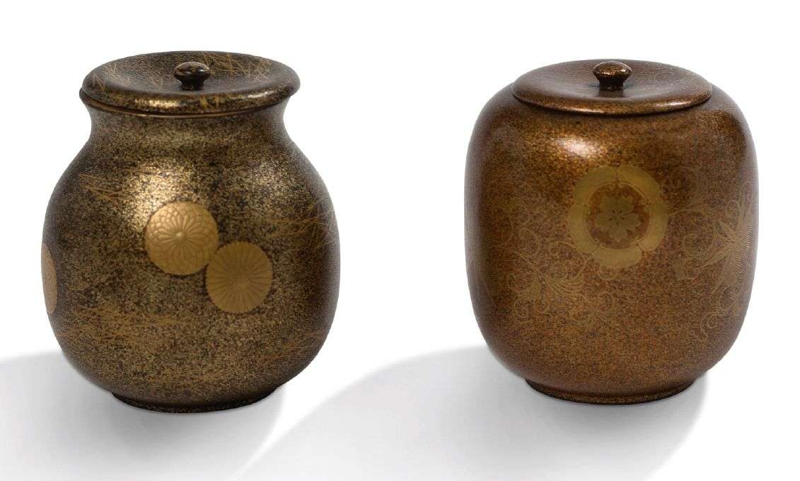Deux takigara-ire, petits pots couverts pour la cérémonie de l'encens, en laque à fond nashiji, l'un, à petit col cintré et panse arrondie orné en hiramaki-e or de