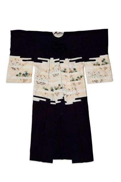 Kimono en soie bleu nuit ornée en partie médiane et aux manches, d'une grande zone écrue en forme de nuage, à décor au pochoir de cerisiers et érables. Avec Mon de type Mitsu-ôgi-maru, «trois éventails dépliés formant un cercle» en partie au dos.