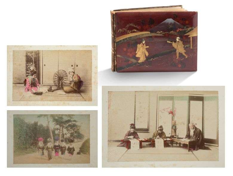 Petit album contenant cinquante photos colorisées, dont 23 représentant des vues célèbres du Japon, les 27 autres mettant en scène divers personnages à l'intérieur ou à l'extérieur. Les plats de l'album en laque rouge, la couverture à décor d'un couple sur fond de Mont Fuji. Dans sa boite en carton doublé de tissu.
