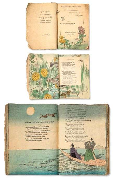 Petit livre sur crépon «Japanese Jingles» par Mae St John Bramhall, Tokyo, 1891, ed. T. Hasegawa, comprenant une série de poèmes en anglais, illustrés de sujets japonais. Dans une boîte postérieure.