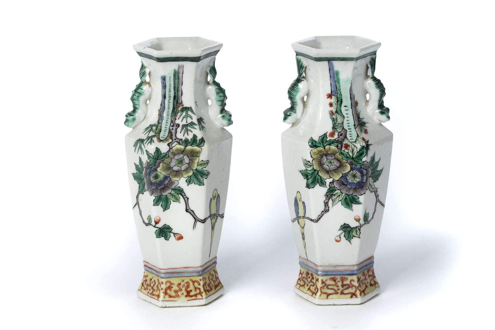 CHINE, Paire de petits vases en porcelaine à pans coupés à décor émaillé dans le goût de la famille verte d'oiseaux branchés, les anses figurant des chimères