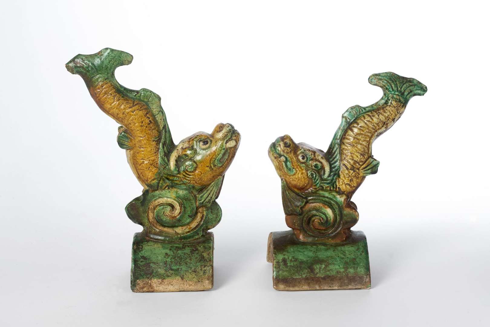 CHINE, Paire de tuiles faîtières en grès émaillé à décor de chimères