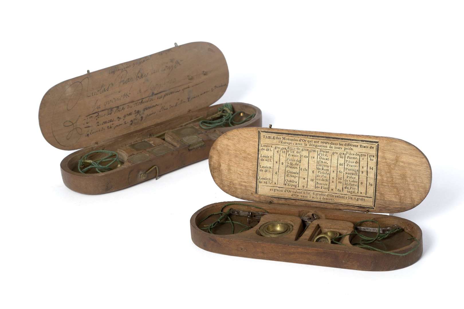 Deux trébuchets de changeur dans leurs étuis en bois, avec poids en laiton, l'un comportant une table xylographiée des monnaies d'or et l'autre des inscriptions manuscrites