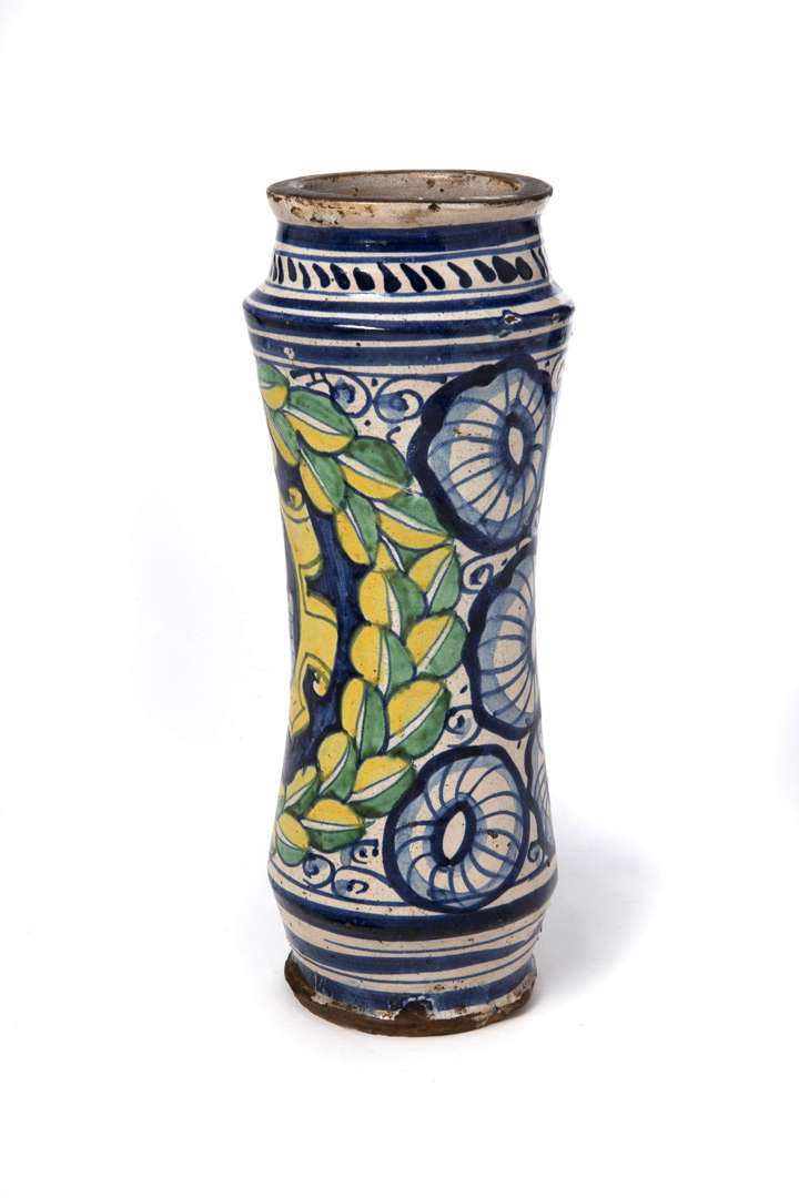 ITALIE, Albarello de forme balustre en faïence à décor polychrome d'armoiries au château fort ceint d'une guirlande de lauriers