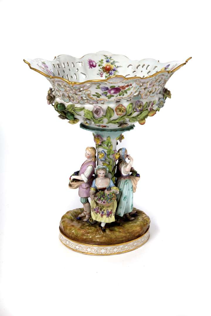 SAXE, coupe ajourée sur piédouche en porcelaine à décor polychrome en relief de quatre personnages aux paniers de fruits et de fleurs