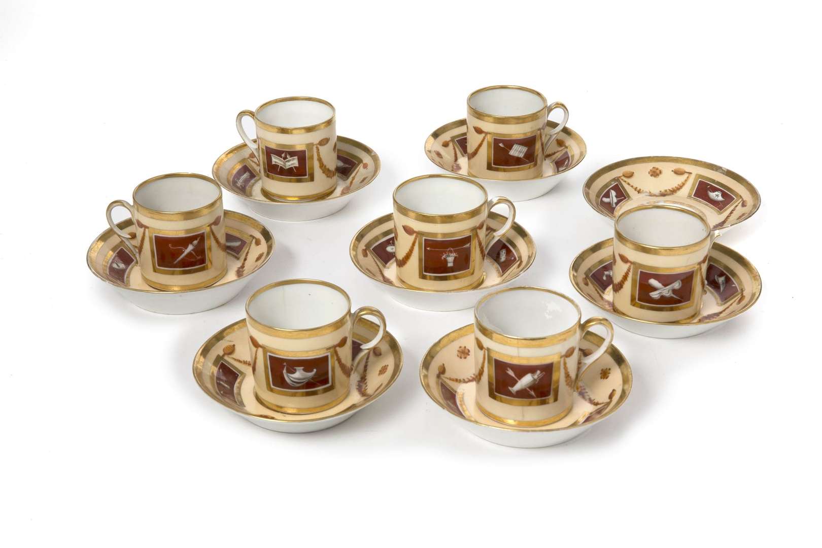 PARIS, Suite de sept tasses litron et huit sous tasses en porcelaine à décor sur fond beige d'attributs des Arts dans des encadrements.