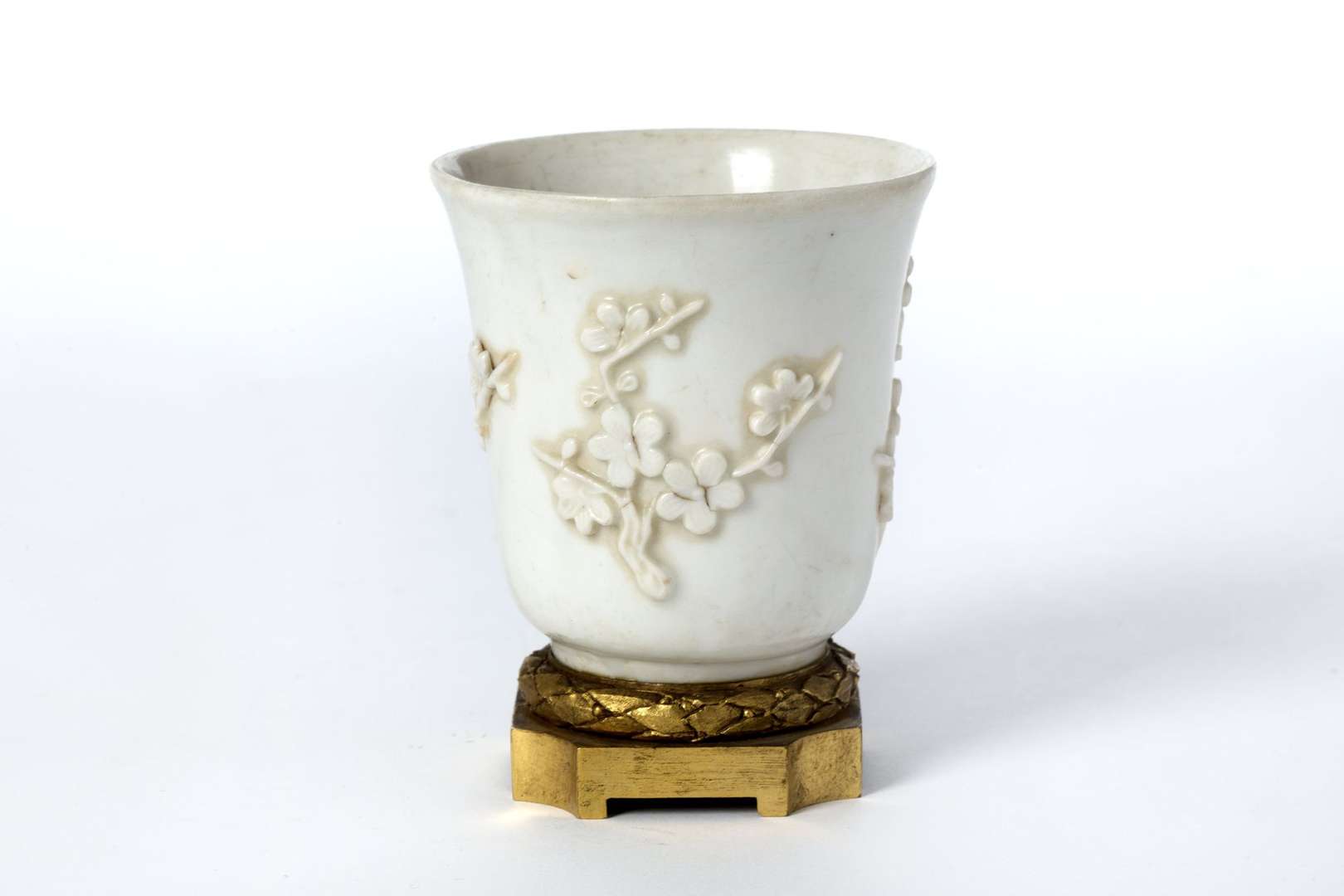 ESCALIER DE CRISTAL, PARIS, gobelet en porcelaine à décor en relief de branches fleuries. Monture en bronze ciselé. Porte une étiquette Escalier de cristal aur revers