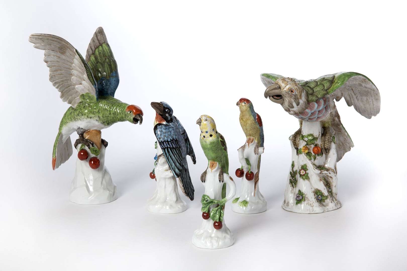 SAXE, PARIS et divers, suite de dix groupes en porcelaine polychrome figurant des oiseaux exotiques branchés