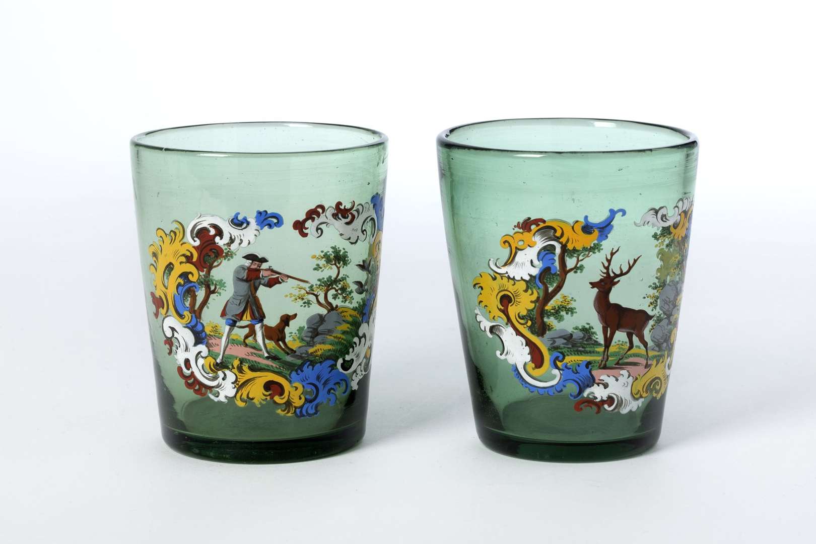 Deux verres à décor émaillé polychrome de scènes cynégétiques dans des réserves