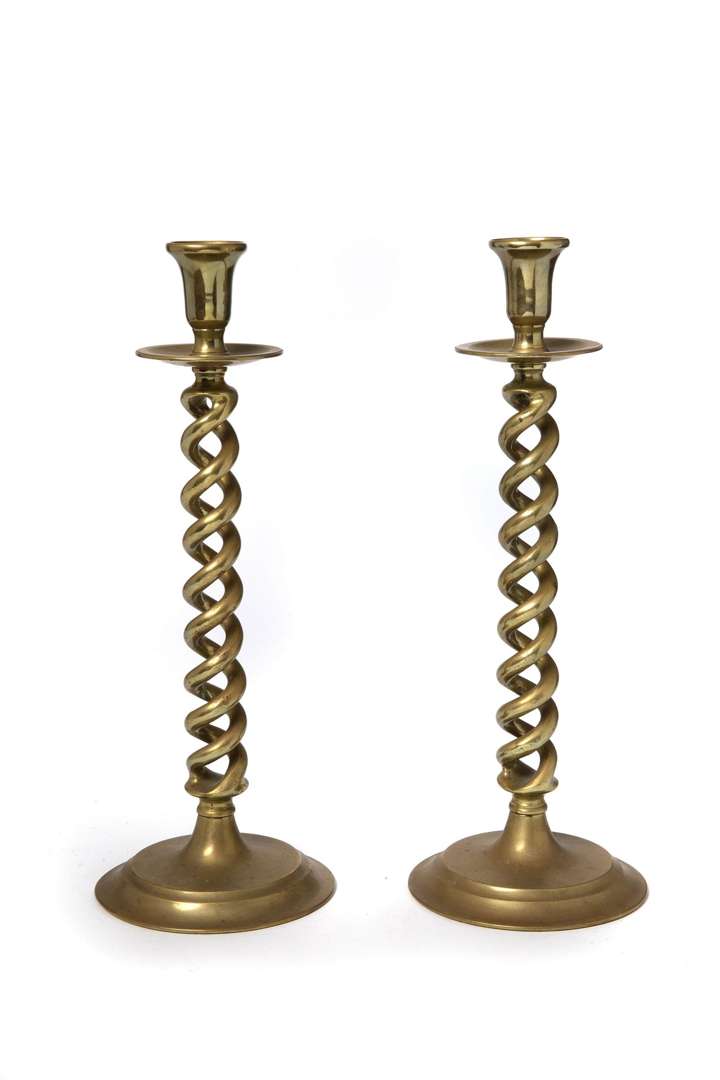 Paire de flambeaux en laiton, le fût à double torsade