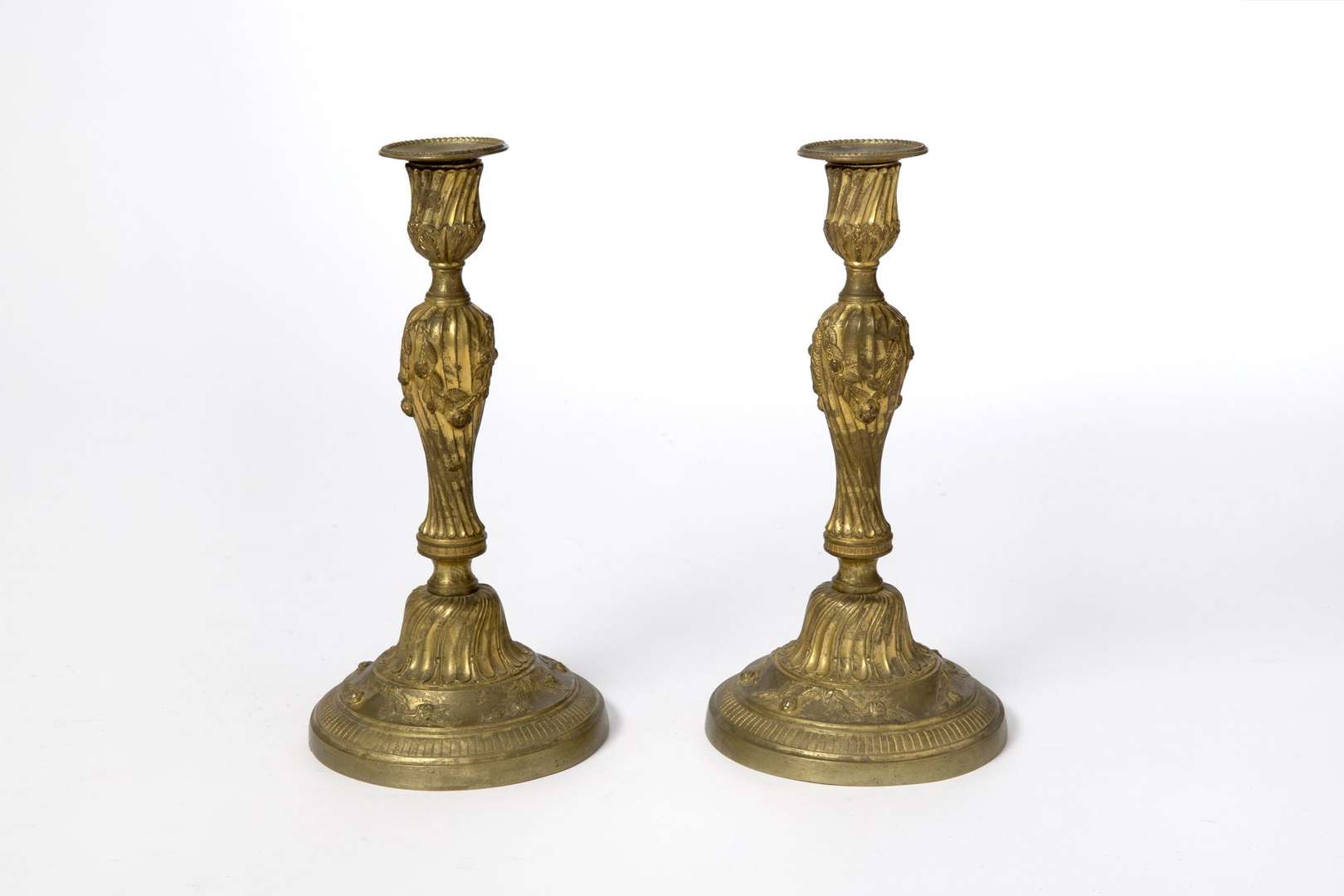 Paire de flambeaux en bronze ciselé de forme balustre à décor de cannelures torses et festons fleuris