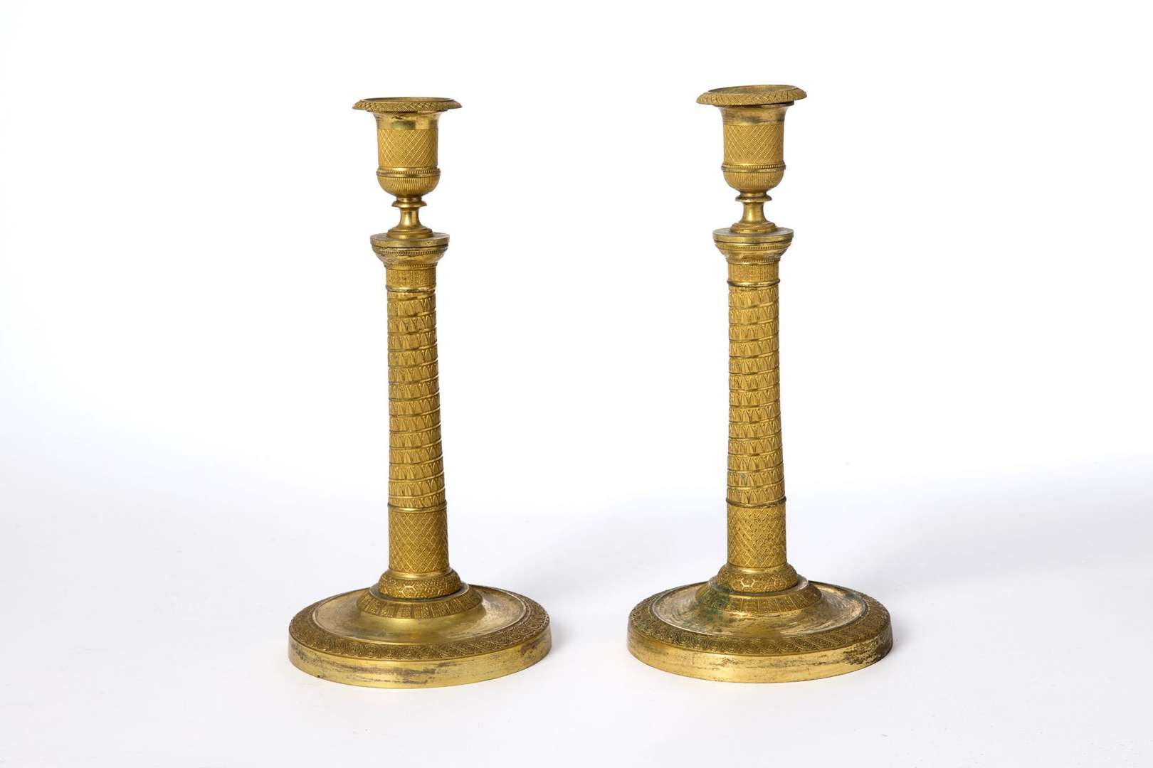 Paire de flambeaux en bronze ciselé doré, le fût formant colonne à frise de raies de coeur