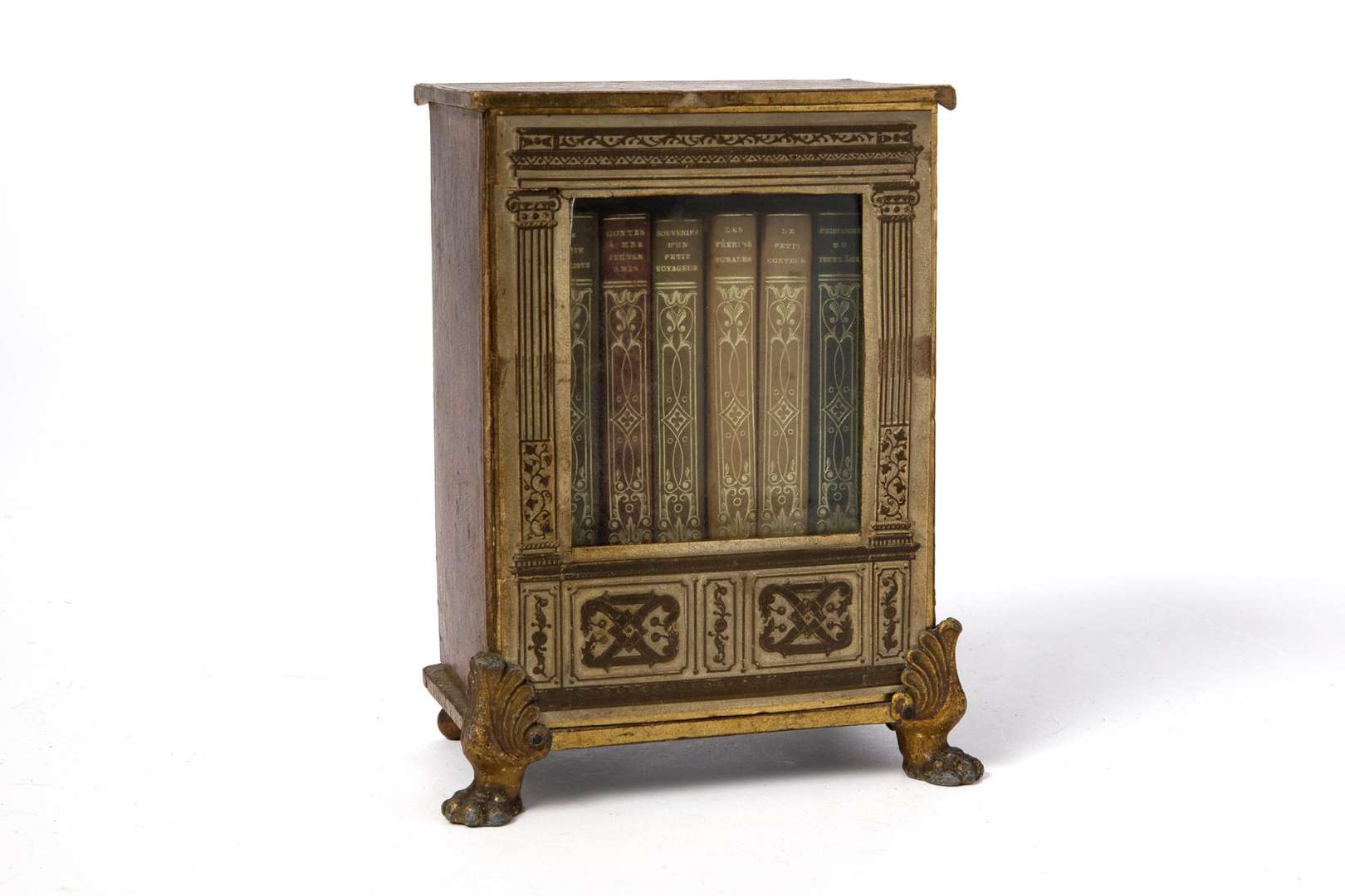 Bibliothèque miniature à pieds griffes contenant six petits ouvrages, réci