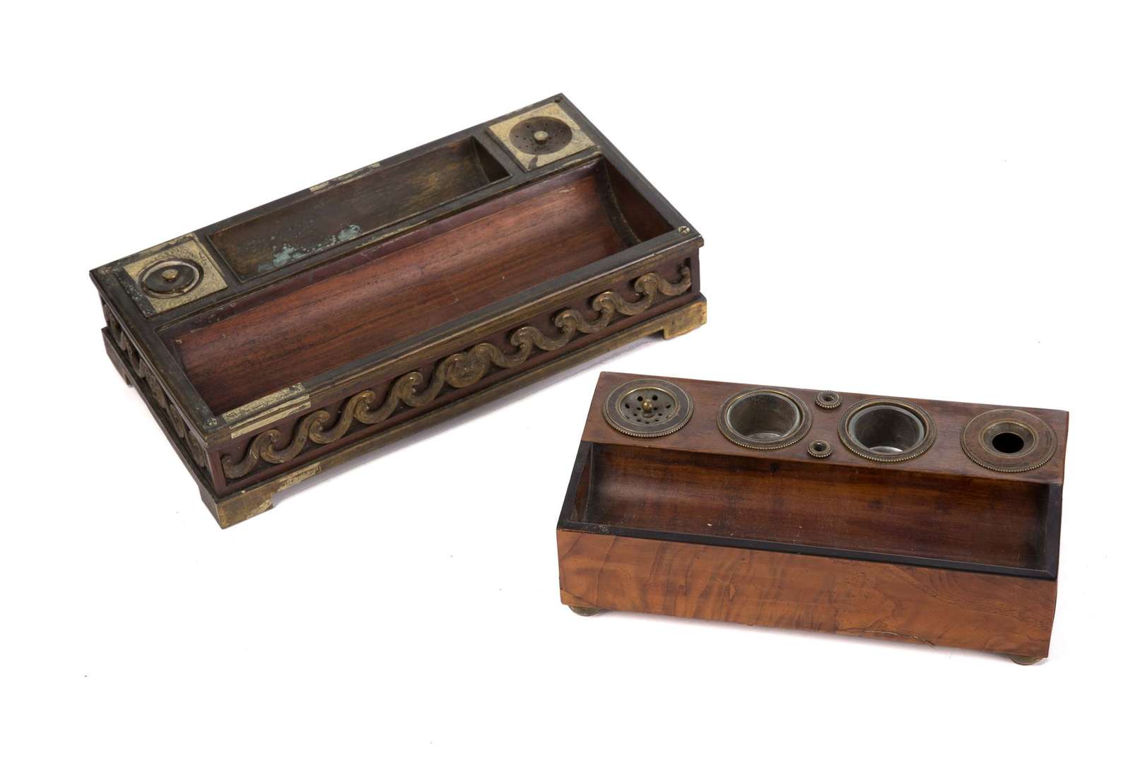 Suite de quatre encriers de bureau rectangulaires en bois et bronze ciselé de tailles diverses, l'un à décor de frises de postes