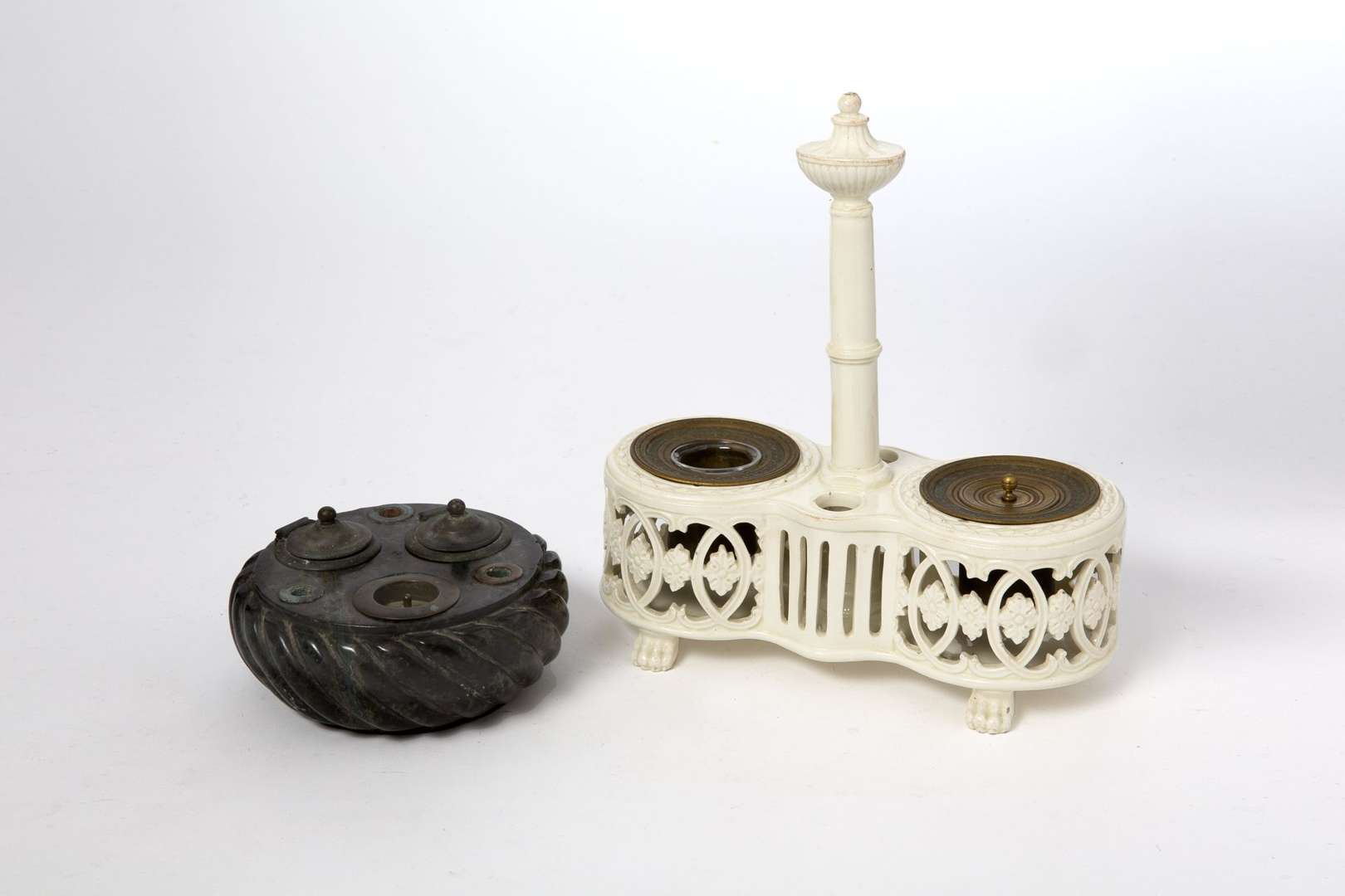 Porte huilier-vinaigrier transformé en encrier en faïence fine à décor ajouré et reposant sur des pieds griffes, et encrier de forme ronde en marbre vert de mer à décor de godrons torses