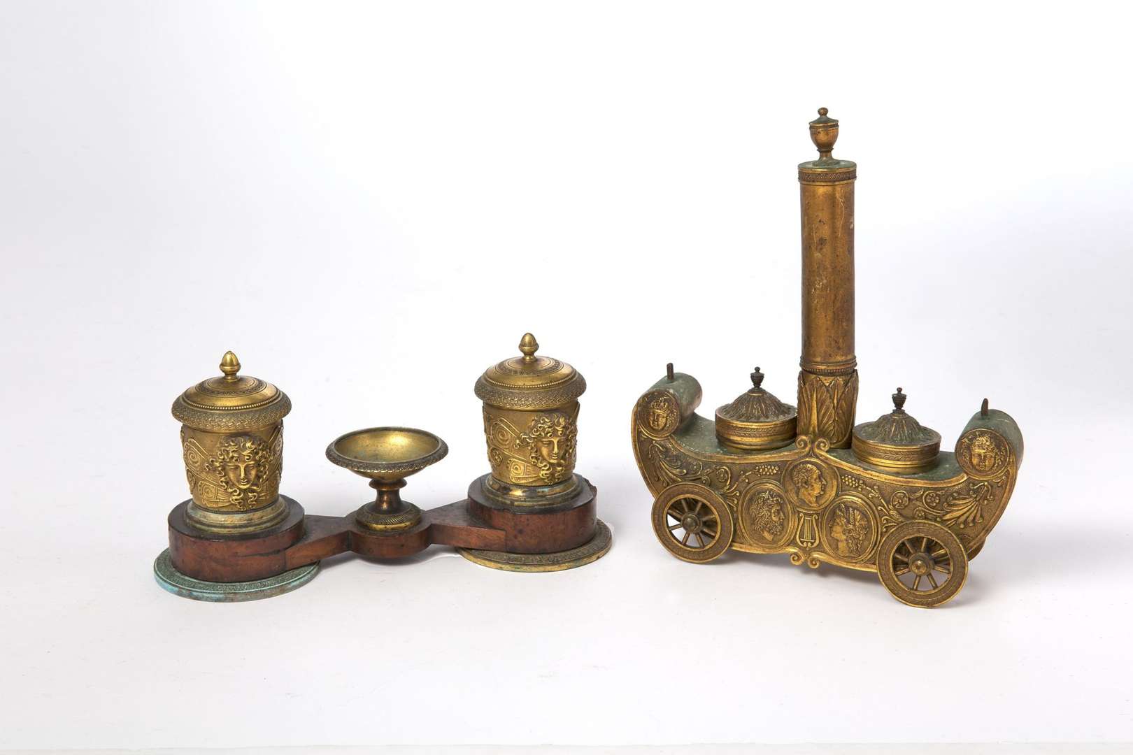 Suite de deux encriers, l'un en acajou moucheté et bronze ciselé à décor de mascarons, l'autre en laiton figurant un char sur roues à décor de profils à l'antique