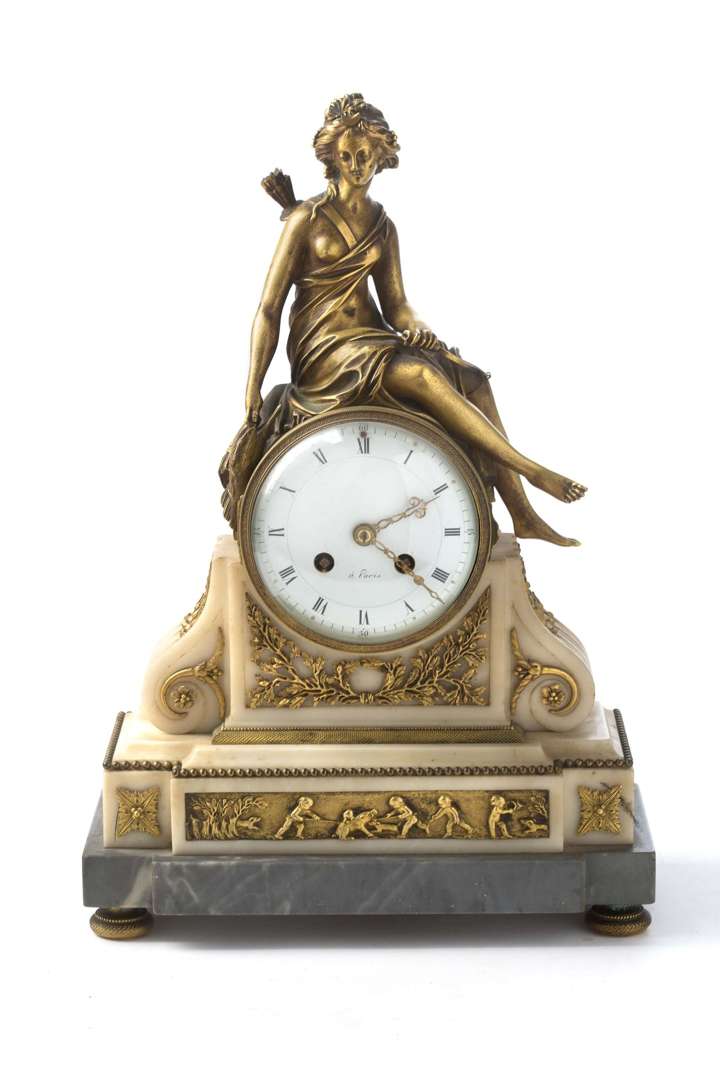 Pendule borne en albâtre et bronze ciselé à décor de Diane Chasseresse et d'une frise de putti chasseurs
