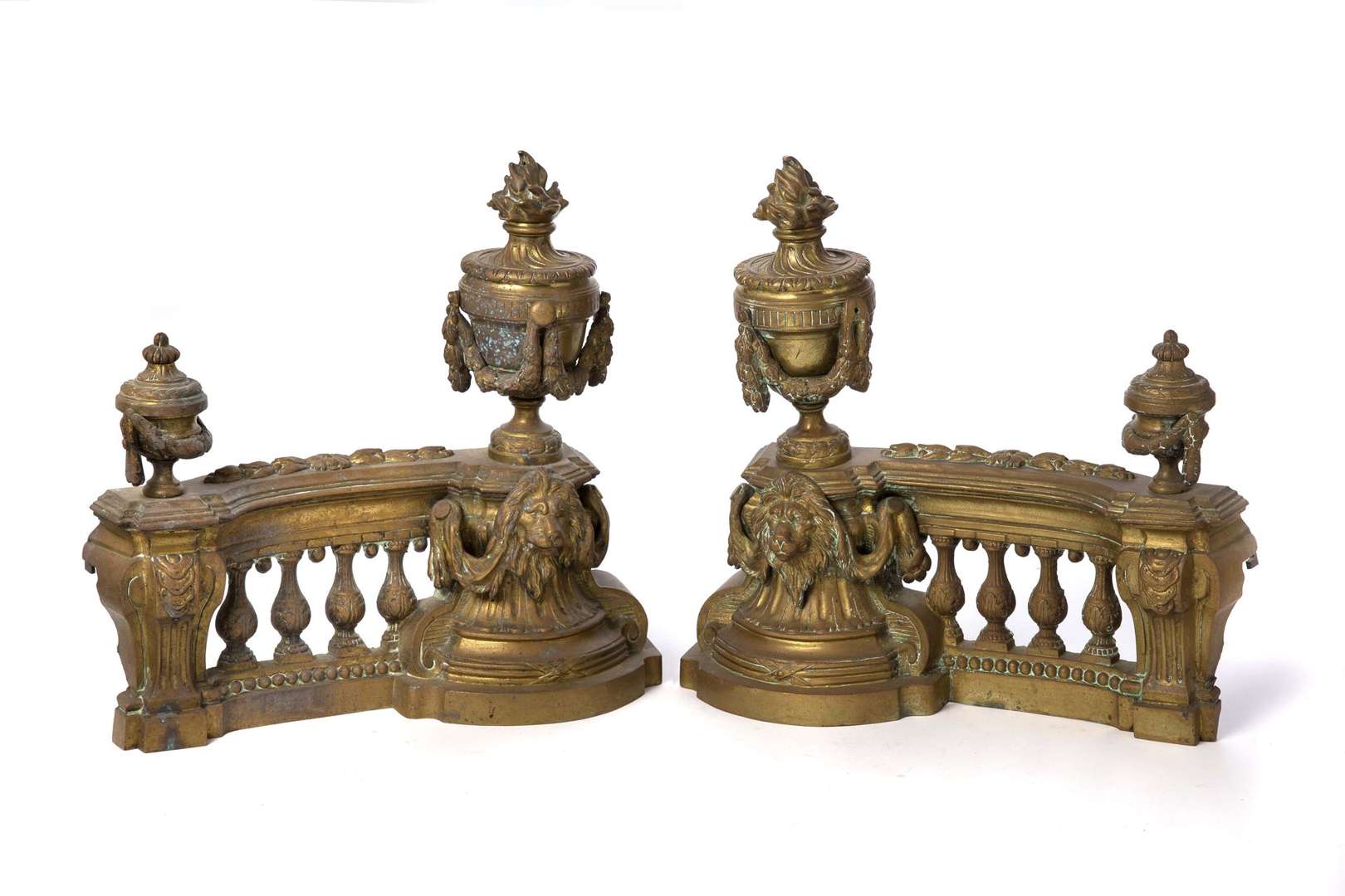 Paire de chenêts en bronze ciselé de style Louis XVI à décor de pot à feu, balustrade ajourée et mufles de lion